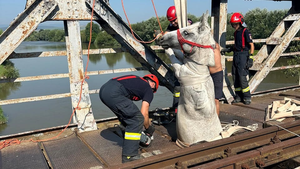 Incidentul s-ar fi produs în timp ce proprietarul se deplasa pe pod cu animalul, iar o tablă de fier din componența podului a cedat, iar calul a rămas blocat, fiind necesară intervenția pompierilor.