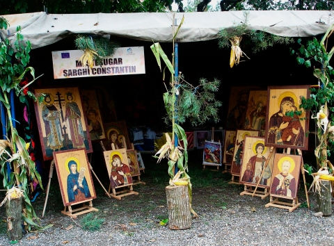 Deşi o afacere este o afacere, faptul că un om s-a aşezat în Noşlac ar părea banal dacă ocupaţia acestuia nu l-ar scoate din anonimat. Costel Sîrghi, omul la care facem referire, s-a aşezat la Noşlac şi cultivă nuci. A aflat de disponibilitatea administraţiei de a ajuta întreprinzătorii dintr-un ziar citit în Atena, în care fostul primar Silviu Vinţeler afirma, într-un interviu, că este deschis oricărei iniţiative. A venit omul, s-a aşezat în sat, şi-a cumpărat nişte teren, şi-a plantat nucii şi în timp ce aceştia cresc s-a apucat de lucru. Constantin Sîrghi este un credincios ce-şi dedică, pe lângă orele petrecute în livada sa de nuci, alte mii de ore pentru a meşteri icoane din baghete de furnir folosind tehnica intarsiei. Venit de la Atena, unde în fiecare an, începând din 2006, a avut câte o expoziţie, atenianul nostru ieşean Constantin Sîrghi a expus pentru prima dată, în judeţul Alba, în cadrul expoziţiilor ocazionate de sărbătoarea „Roadele toamnei”, ce are loc în fiecare an şi este organizată de către administraţia publică din comuna Noşlac. „Am început la vârsta de 10 ani, la fostul „Palat al Pionierilor”, actualmente „Palatul Copiilor” din Iaşi şi am continuat reuşind să mă impun prin expoziţiile organizate la diferite sărbători religioase şi nu numai”, ne-a spus Constantin Sîrghi. Tablourile sale sunt realizate exclusiv folosind furnir din lemn de esenţă moale cu diferite nuanţe ce oferă culori naturale şi care garantează păstrarea nuanţelor odată cu trecerea timpului. Toate lucrările cu care s-a prezentat în expoziţiile lui sunt originale şi făcute cu trudă, în zile şi nopţi de „luptă” cu zecile şi sutele de mii de bucăţele lipite una lângă alta, combinate în aşa fel încât în final să uimească prin colorit şi compoziţie. Acesta ne-a mărturisit că în special face icoane şi că pentru o icoană mai complexă cum ar fi „Cina cea de taină”, munca pentru realizarea ei este de peste 600 de ore de concentrare şi migală, bagetele având o lăţime de doar 1,25 milimetri. ”La comandă pot face şi alte lucrări: icoane, peisaje, flori etc. cu modelul ales de client. Lucrările prezentate aici sunt transpuse pe suport tip MDF placat cu furnir din lemn pe toate laturile. Protejarea exterioară a lucrării se execută prin triplă lăcuire, cu lac incolor cu rezistenţă sporită la intemperii”, ne-a destăinuit domnul Constantin Sîrghi. Având o ordonare atentă a culorilor atât pe orizontală cât şi pe verticală, milimetru cu milimetru, munca artistului a dus la realizarea unor lucrări deosebit de interesante, având un caracter unic atât în România cât şi în lume. În această tehnică folosită, regăsim arta şi măiestria execuţiei fiecărei lucrări în parte. Timpul lung de execuţie, sutele de ore de muncă pentru fiecare lucrare în parte, împreună cu meticulozitatea, rafinamentul şi tehnica de lucru folosită, dau o valoare deosebită lucrărilor, din cauza dificultăţii execuţiei ei, arta intarsiei fiind foarte puţin răspândită. Ceea ce este de remarcat la icoanele lui Constantin Sîrghi este faptul că deşi foloseşte o tehnică mai puţin cunoscută şi chiar grea, frumoasele sale icoane sunt realizate cu respectarea canoanelor Bisericii Ortodoxe, fapt care a făcut să fie apreciate şi de vizitatori şi de oficialităţile prezente la sărbătoarea noşlăcanilor.