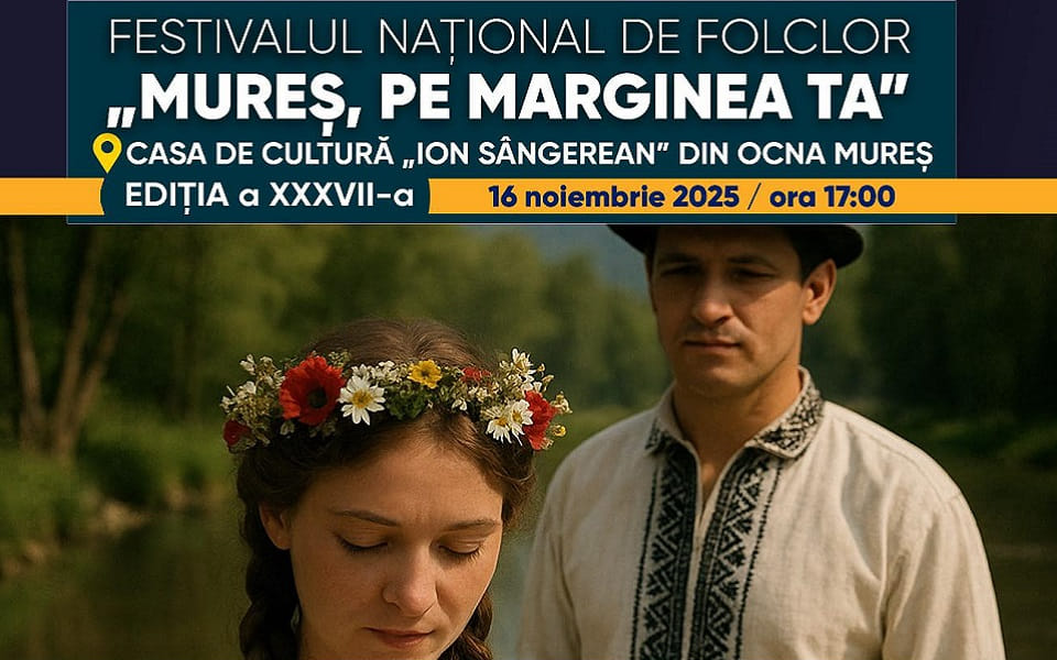 Duminică, 16 Noiembrie 2025, de la ora 17.00, pe scena Casei de Cultură „Ion Sângerean” din Ocna Mureș va avea loc Festivalul concurs „Mureș, pe marginea ta” – ediția a XXXVII-a, un festival național de folclor, cu un extraordinar program artistic. Un concurs de interpretare vocală, a muzicii tradiționale românești.
