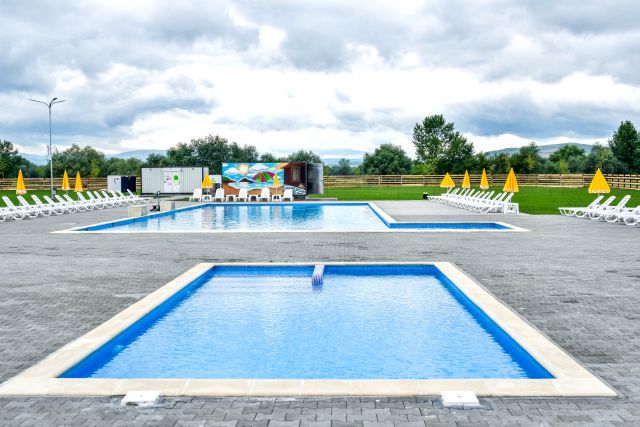 Piscinele din complex sunt impecabil realizate de firma Alba Decor, din piatră și faianță mozaic de culoare albastru. Iluminatul nocturn al piscinelor te duce cu gândul la paradisul grecesc din Creta, briza Mureșului înlocuiește perfect vântul de pe Marea Egee iar țârâitul greierilor din liniștea nopților de vară se aseamănă melodiilor cântate cu un bouzouki elen. Merită încercat! Pentru încălzirea, purificarea și recircularea apei din piscină (care nu este salină) a fost achiziționată o instalație complicată, care ocupă o cameră. Baza piscinei este curățată zilnic cu un aspirator special. Clienții beneficiază de șezlonguri, umbrele și acces la bar. Deci, poftiți de serviți! Complexul ”Bellavi” vă așteaptă zi de zi!
