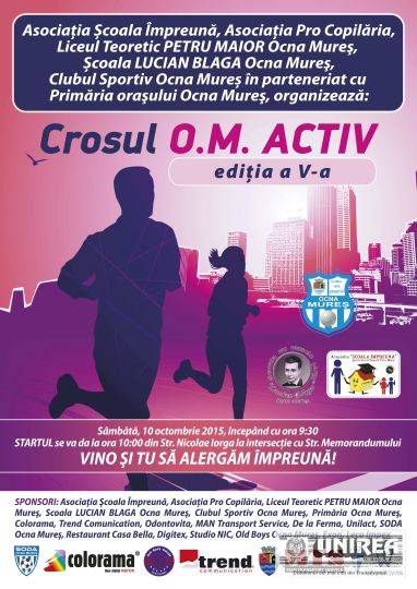 Asociaţiile Şcoala Împreună și Pro Copilăria, Liceul Teoretic „PETRU MAIOR” Ocna Mureş, Şcoala „LUCIAN BLAGA” Ocna Mureş, Clubul Sportiv Ocna Mureş în parteneriat cu Primăria Oraşului Ocna Mureş, organizează: “CROSUL O.M. activ”, editia a V-a, sâmbătă, 10 octombrie 2015, începând cu ora 9.30.